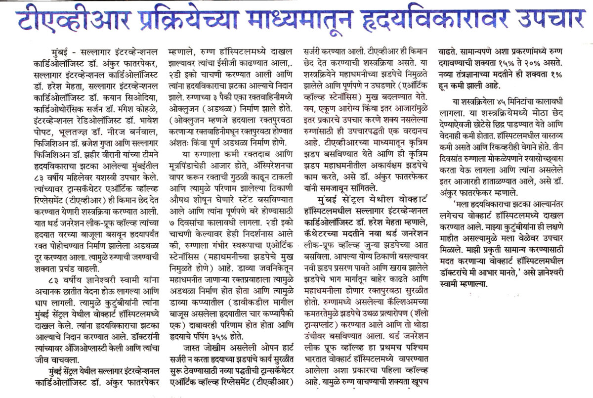 ”Instead of performing high-risk open-heart surgery, a novel Transcatheter aortic valve replacement (TAVR), was carried out to aid the normal function of Heart Valves. “TAVR is a minimally invasive procedure to replace a narrowed aortic valve that fails to open properly (aortic valve stenosis). It is a boon for the patients who are not candidates for other treatment options because of their age, overall health or other medical issues. The goal of TAVR is to implant a new, artificial valve to take over the job of the damaged aortic valve,” explained Dr Ankur Phaterpekar.