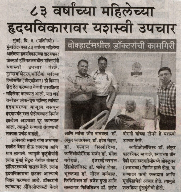 Dr Ankur Phatarpekar, Consultant Interventional Cardiologist, Wockhardt Hospital, SoBo, said, “On arrival, the patient underwent, ECG & 2DEcho it was revealed that the patient suffered from a heart attack, and 1 of her 3 arteries of heart was occluded (occlusion means the partial or complete obstruction of blood flow in a coronary artery). The patient also had other comorbidities such as low blood pressure and kidney problems. The blood clot was removed using aspiration, and the affected session was treated using a drug-eluting stent, and she took about 7 days to recover fully. During the 2DEcho it was also found that the patient had severe Aortic Stenosis (that is a narrowing of the aortic valve opening). It restricts the blood flow from the left ventricle to the aorta and may also affect the pressure in the left atrium (one of the four chambers of the heart, located on the left posterior side) with heart-pumping of 35%.